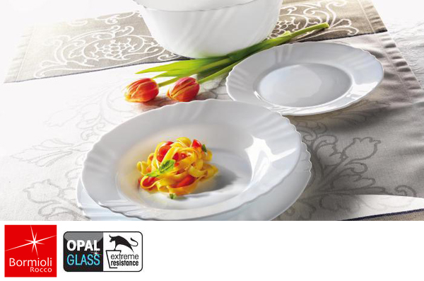 Opálové sklo, lehké, odolné proti otlučení, vhodné do mikrovlnné trouby a myček nádobí.