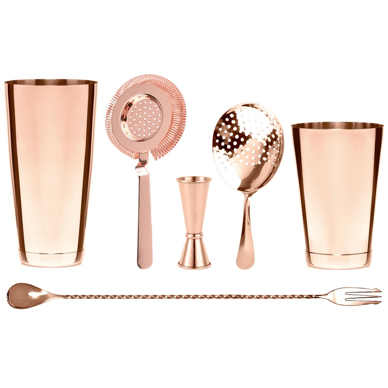 Barmanská sestava v měděné barvě se hodí do každého baru pro přípravu míchaných drinků a jiných nápojů.
