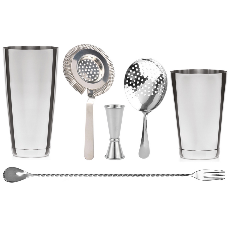 Barmanská sestava ve stříbrné barvě se hodí do každého baru pro přípravu míchaných drinků a jiných nápojů.
