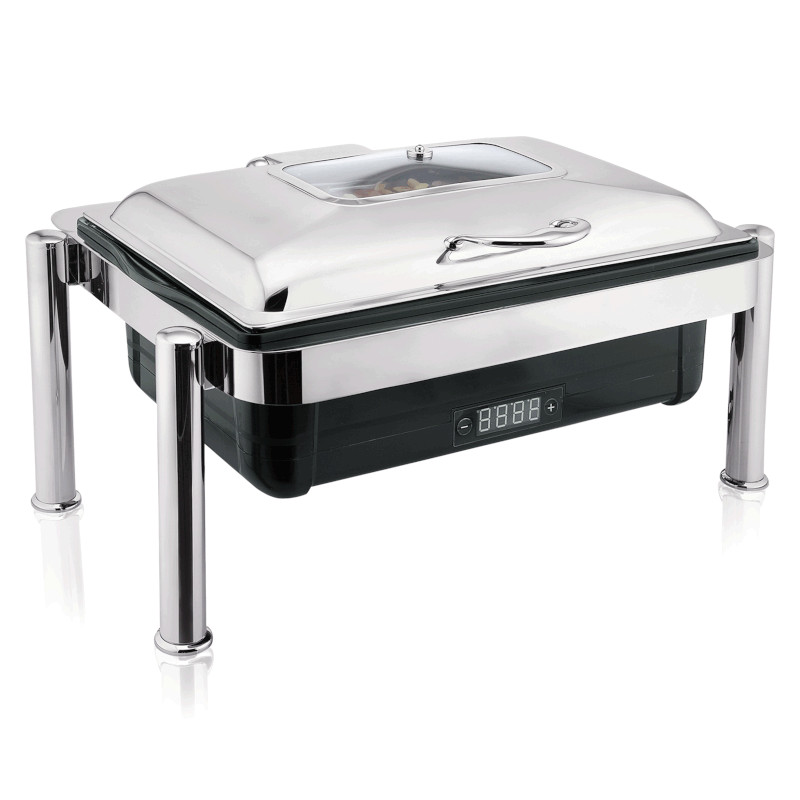 Elektrický chafing s regulačním termostatem pro gastronádobu GN 1/1 (65 mm) se skvěle hodí pro podávání různých snídaňových rautů či jinde, kde je třeba jídlo teplé. Digitální displej poskytuje předvolbu teploty mezi 20 °C a 85 °C. Výklopné víko z nerezové oceli s okýnkem umožňuje vidět stav a množství podávaných pokrmů