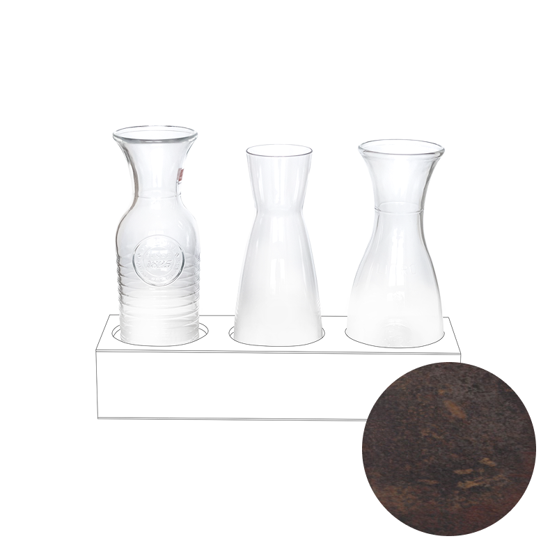 Chladicí box na láhve je řešení pro snídaňové bufety, hotelové restaurace a cateringové služby, kde je důležité udržet nápoje v optimální teplotě po celou dobu servisu.Box je vybaven otvory pro tři láhve nebo karafy, což zajišťuje stabilní umístění a snadnou manipulaci při nalévání. Dvě chladicí vložky udržují nápoje vychlazené bez nutnosti přímého kontaktu s ledem. Dekor rzi dodává boxu naturální vzhled, který se snadno začlení do různých gastronomických konceptů.