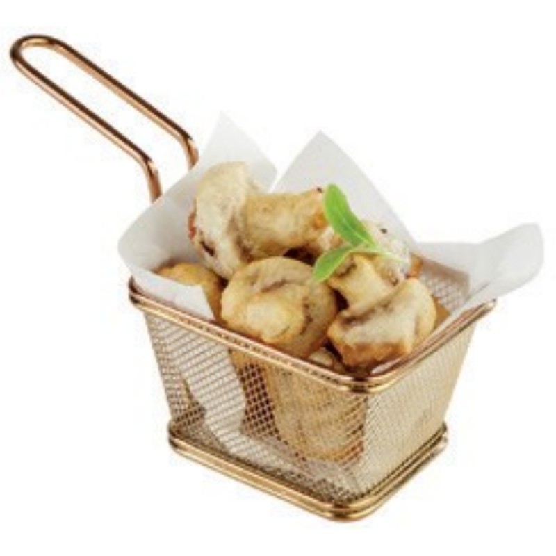 Servírovací košík umožňuje smažit malé množství zeleniny, brambor, krevet nebo čehokoliv jiného. Také parádně poslouží k samotné prezentaci pokrmů na jídelním stole. K představování doporučujeme nejprve vložit olejový papír do košíku a až na něj umístit smažené jídlo. Tak dosáhnete jednoduchého a stylového efektu. Košík se vyrábí z kvalitní nerezové oceli a zajišťuje elegantní způsob prezentace vašich pokrmů.