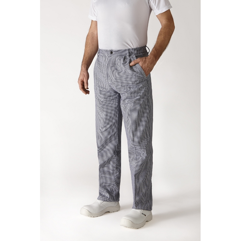 Kalhoty vyrobené z bavlny ve volnějším střihu. Použití prodyšné tkaniny zaručuje regulaci tělesné teploty a pohodlí při používání. Dvě přední kapsy a pas s elastickými stranami poskytují praktičnost a komfort, zatímco prošívání na kolenou dodává styl a eleganci. Kalhoty lze průmyslově prát v pračkách.