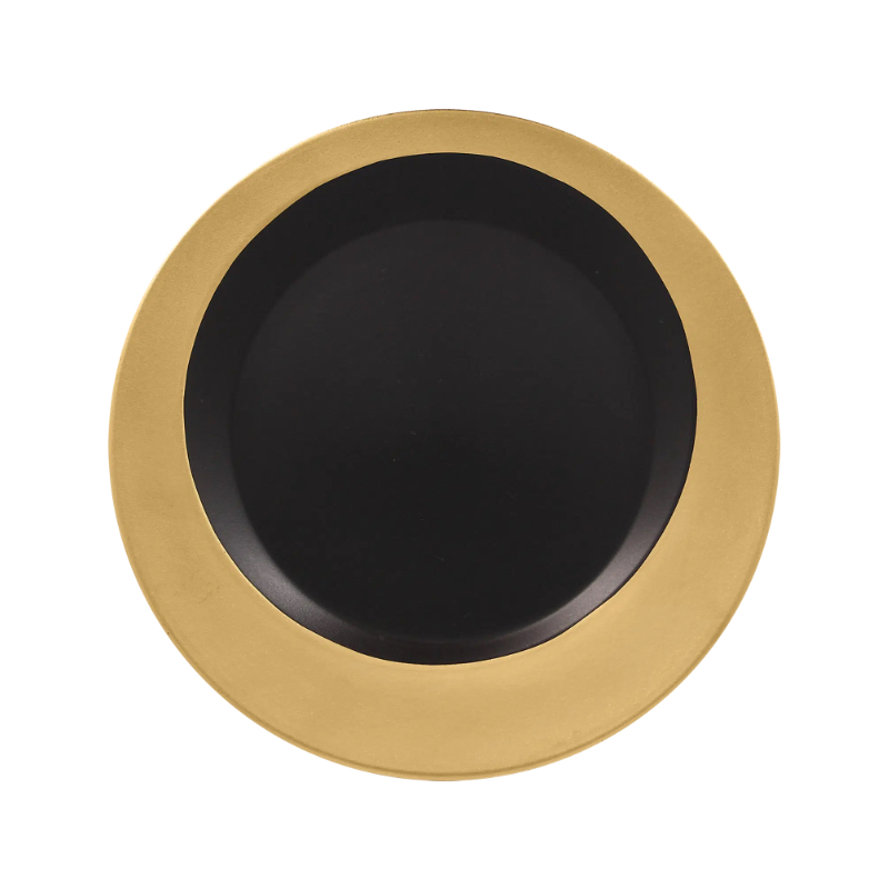 Porcelánový kulatý talíř s kruhovým reliéfem ve zlatém dekoru a tajemně černým středem dodává vkusnou a elegantní atmosféru. Vaše hosty ohromí, zaujme a zpříjemní jim gastronomický zážitek. Prvotřídní porcelán zaručuje kromě svého atraktivního designu také svou odolnost a kvalitní zpracování.