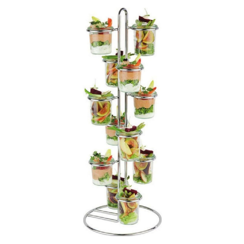 Stojan je ideální pro podávání bufetů, rautů nebo švédských stolů ve vašem podniku. Je určený pro pohárky Fingergood (TF-314 a TF-310), které se do něj umístí a můžete takto vkusně a zajímavě podávat různé pokrmy. Můžete na něj umístit až 12 takových pohárků o průměru 60 mm. V balení se nachází pouze stojan bez pohárků a sklenice je třeba zakoupit samostatně. Stojan z pochromované oceli dokonale zapadne do místnosti, ve které bude umístěn. Může být použit profesionály i amatérskými kuchaři.