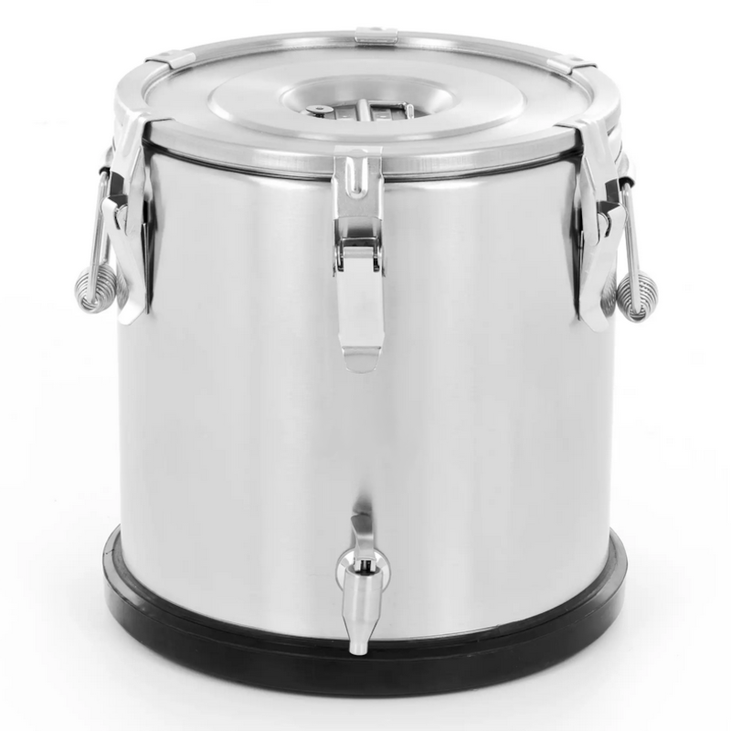 Prefesionální termos Duplitherm o objemu 20 l špičkové kvality s dvojitým pláštěm izolovaným speciální pěnou slouží pro udržení horkých i studených pokrmů a nápojů v ideální teplotě až po dobu 8 hodin. Jedná se o skvělého pomocníka při přepravě horkých jídel a tekutin. Víko s odolným silikonovým těsněním se postará o udržení správné teploty a zabraňuje vytékání tekutin a uchycuje ho 6 masivních přezek. Ergonomické rukojeti s vícebodovým svařováním slouží pro pohodlnou a bezpečnou manipulaci a úchyt víka pro zvedání víka (nepoužívejte ke zvedání várnice). Várnice vybavena výpustným kohoutem.