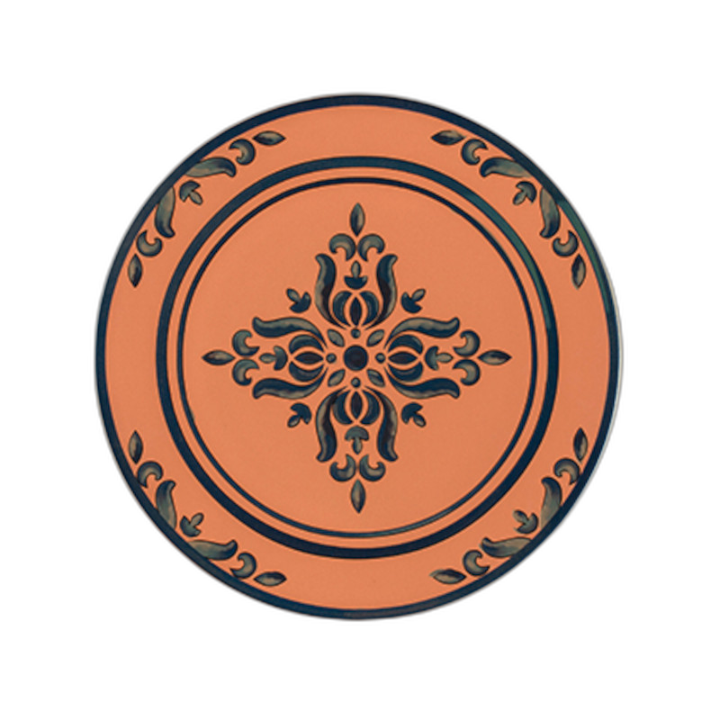 Kulatý mělký jídelní talíř vyrobený z prvotřídního porcelánu s povrchovou úpravou terakotového vzhledu a ručně aplikovaným zdobením.